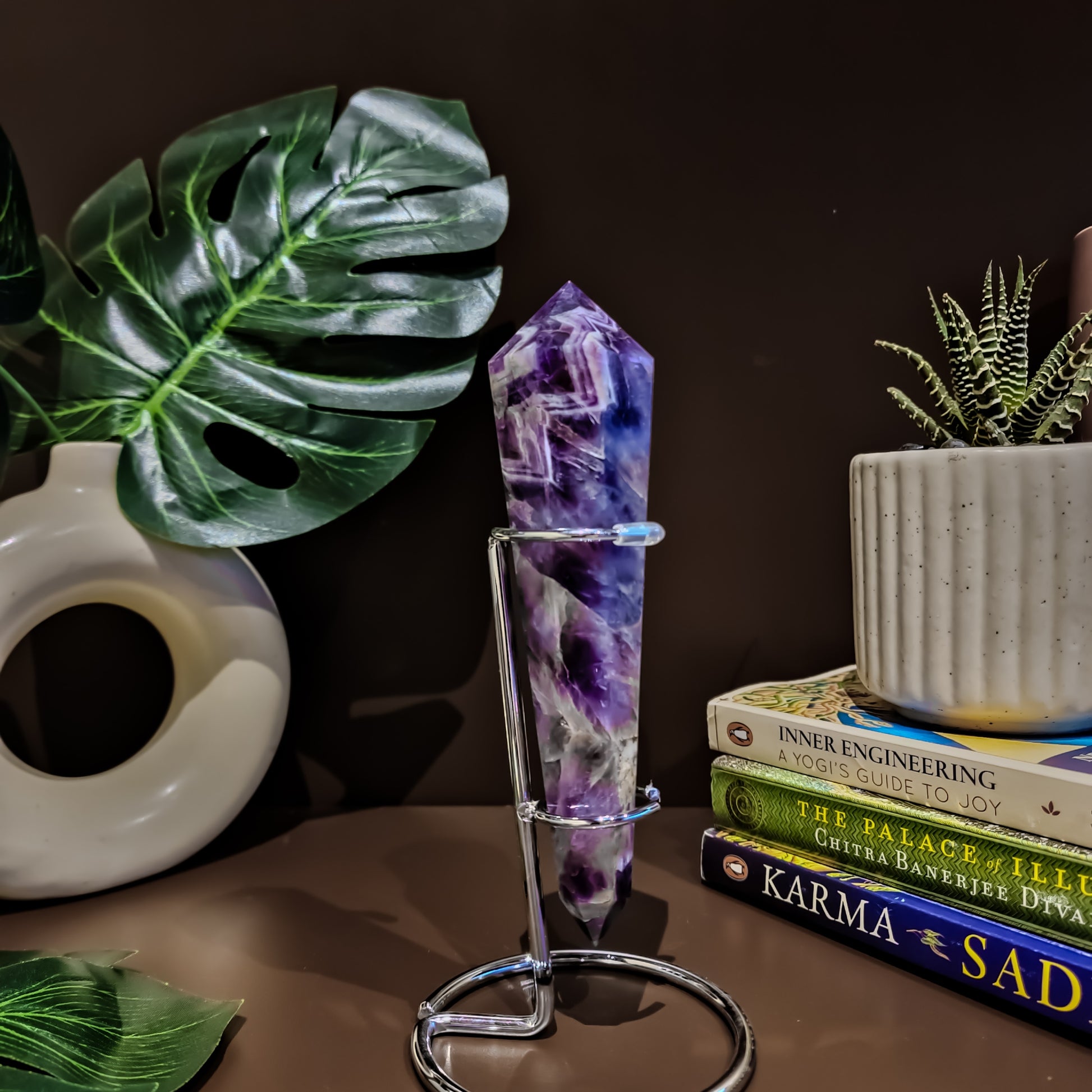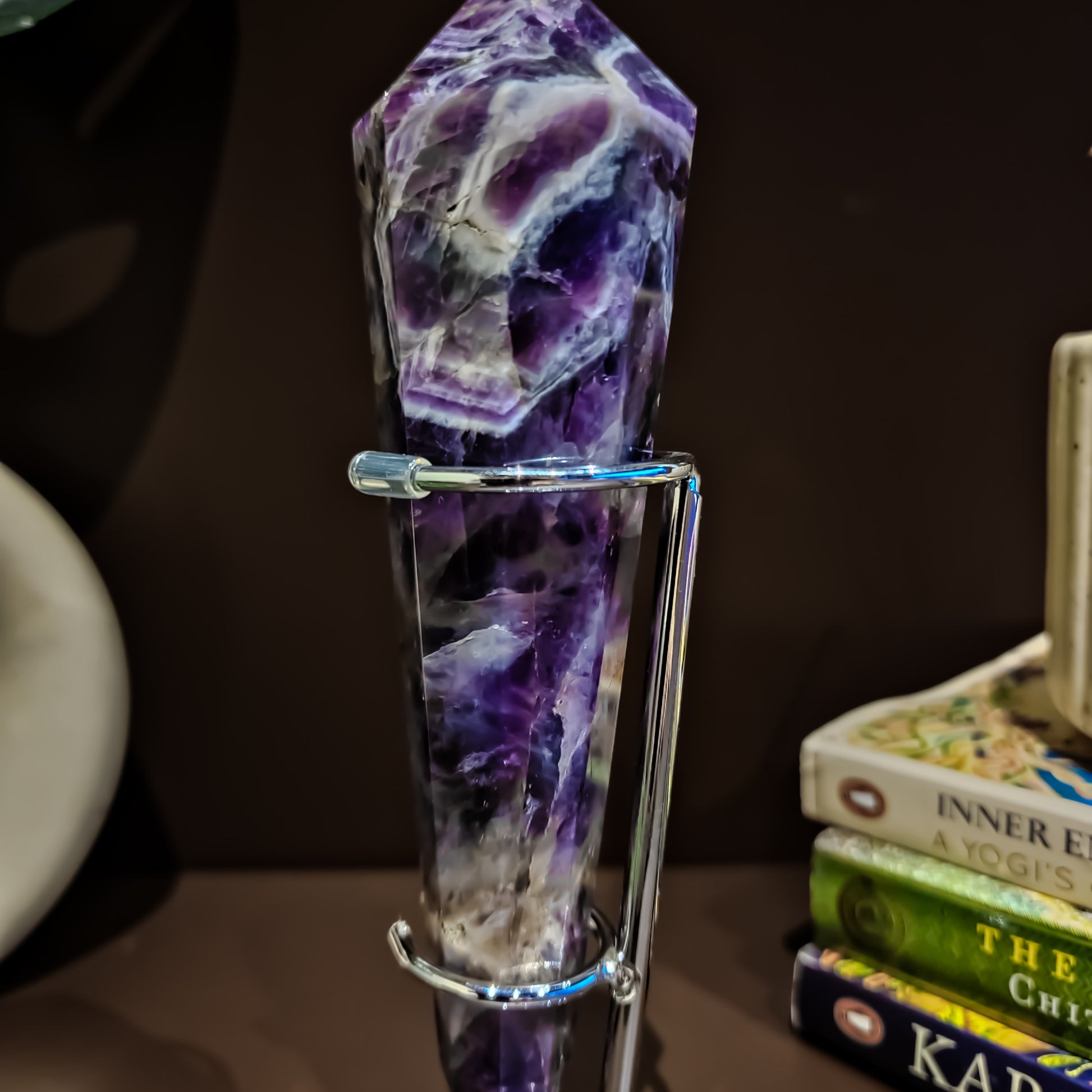 Enhance Your Space With The Amethyst Healing Wand, Beautifully Showcased In A Sleek Stainless Steel Stand. Known For Its Calming And Protective Energy, Amethyst Is Believed To Relieve Stress, Promote Clarity, And Aid In Spiritual Growth. Whether Placed In A Meditation Space, Office, Or Living Room, This Exquisite Piece Blends Healing And Luxury Decor Seamlessly.