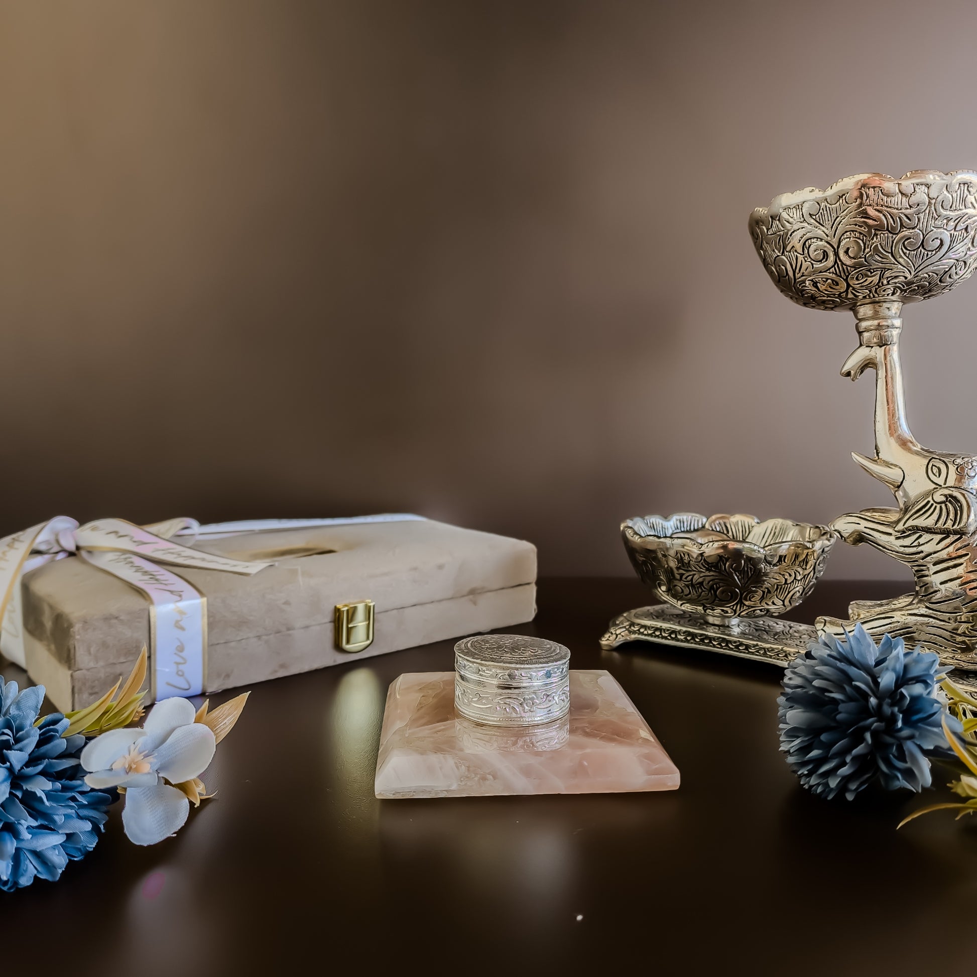 Grace your gifting experience with our Rose Quartz reusable Coaster - Square, paired with an Intricately Worked Round Silver Dibbi filled with Premium Whole Elaichi. The polished white quartz coaster radiates subtle sophistication, while the silver dibbi adds a touch of timeless elegance. The premium elaichi completes the thoughtful, auspicious ensembleβideal for festive occasions and premium gifting.