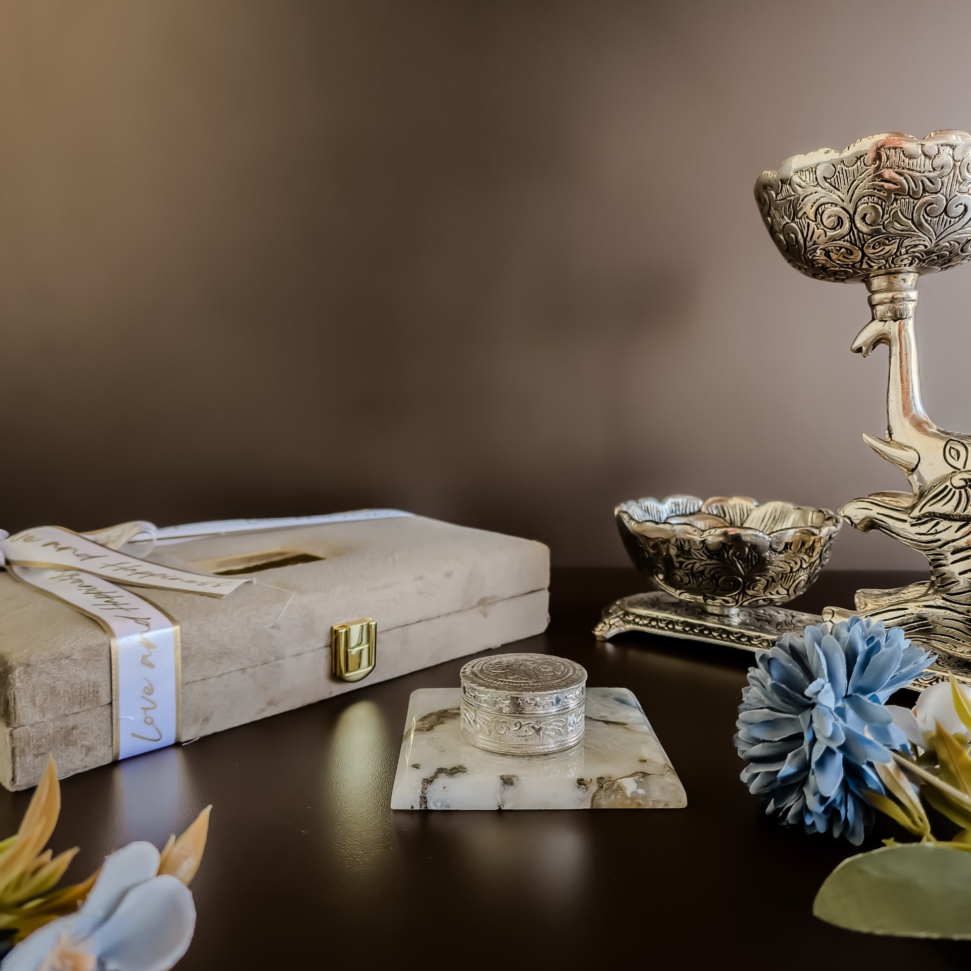 Infuse uniqueness into your gifting with our Natural Agate reusable Coaster - Hexagonal set alongside an Intricately Worked Round Silver Dibbi filled with Premium Whole Elaichi. The hexagonal coaster, handcrafted from natural agate, brings a bold geometric charm, while the silver dibbi with detailed design adds traditional richness. Finished with the freshness of premium elaichi, this is a sophisticated, meaningful gift perfect for festive and celebratory occasions.
