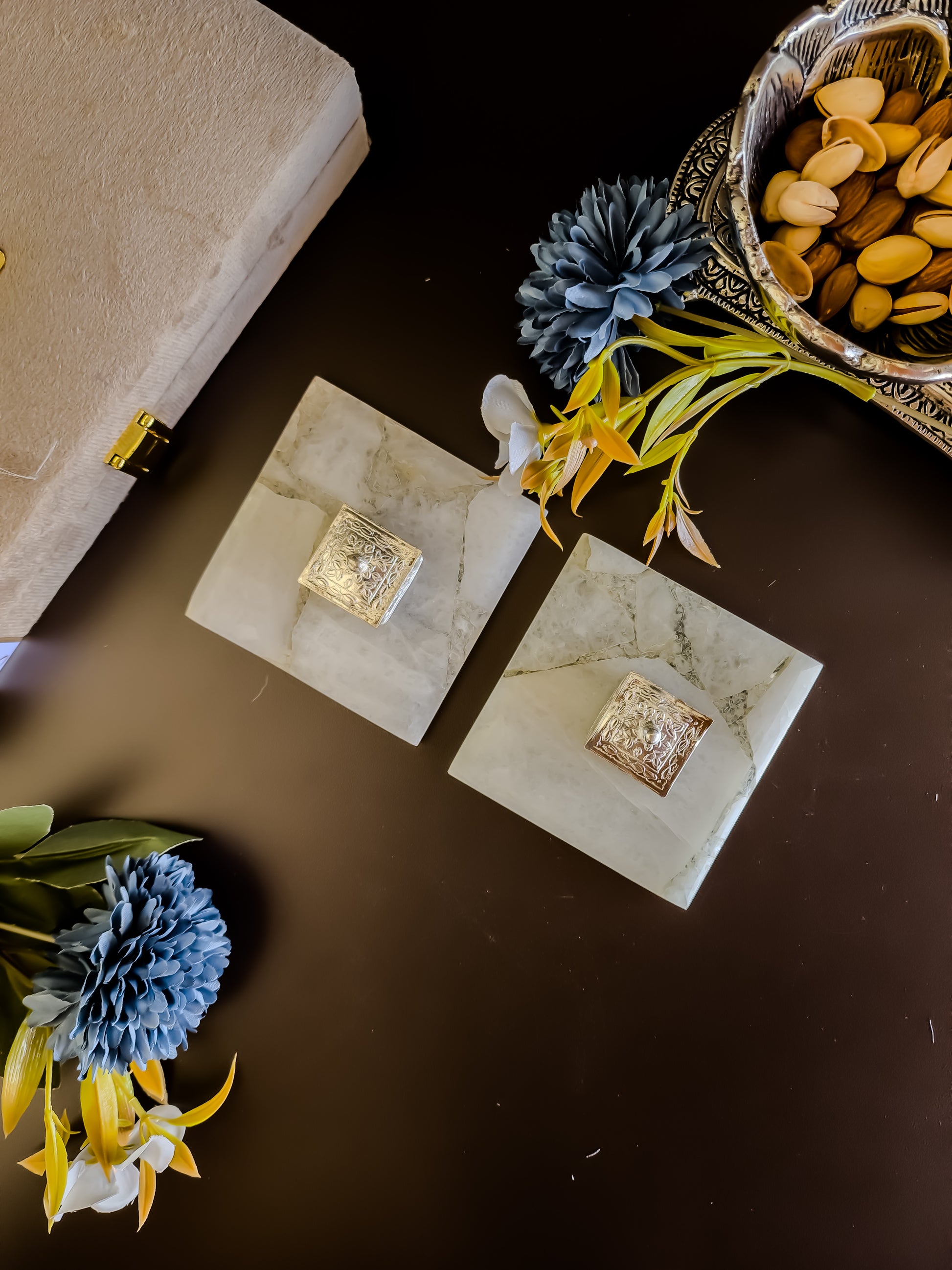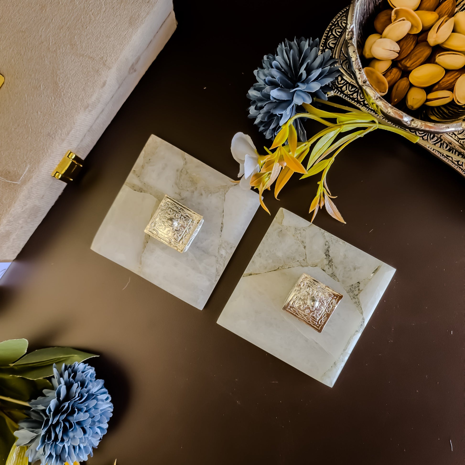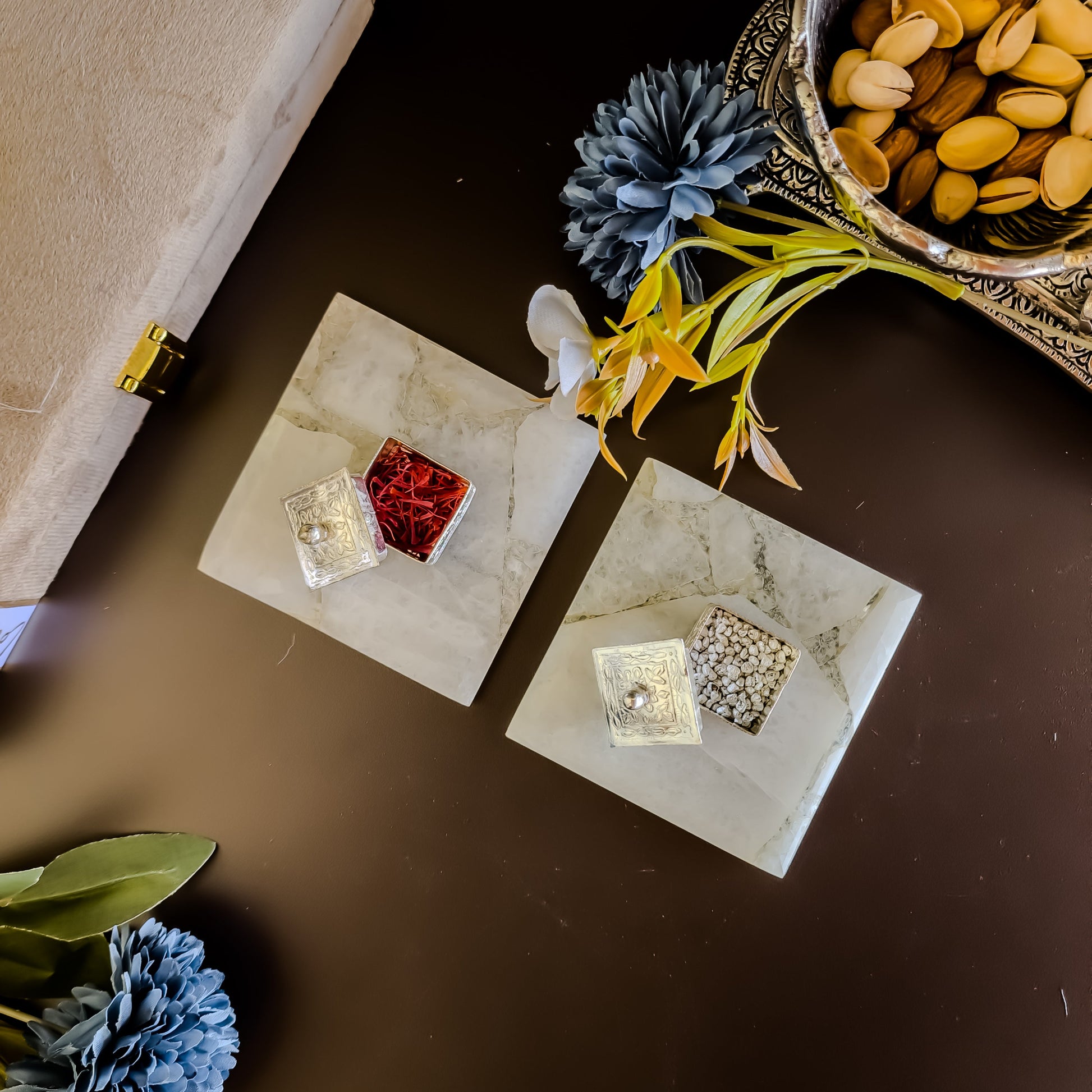 Indulge in the art of luxurious gifting with our Kesar Elaichi Luxe Set, a refined ensemble designed to impress. This set features two exquisite gemstone coasters handcrafted to perfection, accompanied by two silver-plated intricately worked square dibbis. One dibbi is filled with premium-grade kesar (saffron), renowned for its purity and fragrance, while the other is filled with shimmering silver pearls. Perfect for weddings, festive occasions, or special milestones, this set beautifully blends elegance, wellness, and traditional charm.