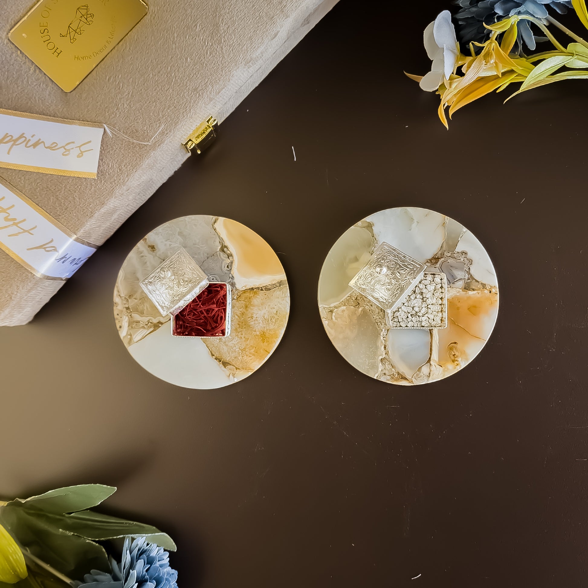 Indulge in the art of luxurious gifting with our Kesar Elaichi Luxe Set, a refined ensemble designed to impress. This set features two exquisite gemstone coasters handcrafted to perfection, accompanied by two silver-plated intricately worked square dibbis. One dibbi is filled with premium-grade kesar (saffron), renowned for its purity and fragrance, while the other is filled with shimmering silver pearls. Perfect for weddings, festive occasions, or special milestones, this set beautifully blends elegance, wellness, and traditional charm.