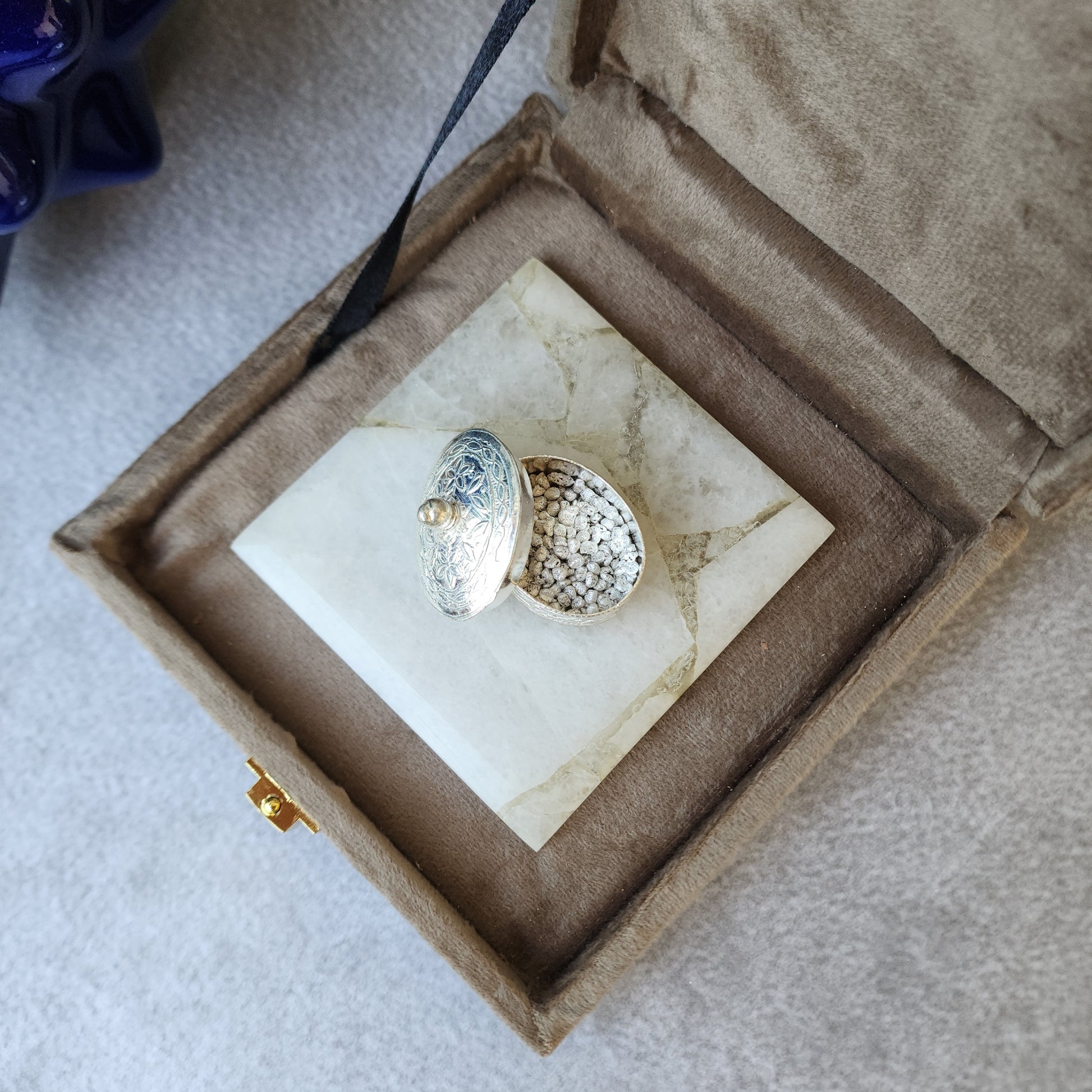 This Luxurious Gemstone Coaster With An Intricately Carved Silver Dibbi Is A Perfect Blend Of Elegance And Tradition. The Coaster, Crafted From A Natural Gemstone, Adds A Touch Of Sophistication To Any Table Setting, While The Beautifully Detailed Silver Dibbi Serves As A Refined Holder For Premium Elaichi (Cardamom). Designed To Be Both Decorative And Functional, This Set Makes An Exquisite Addition To Your Home Or A Thoughtful Gift For Special Occasions.