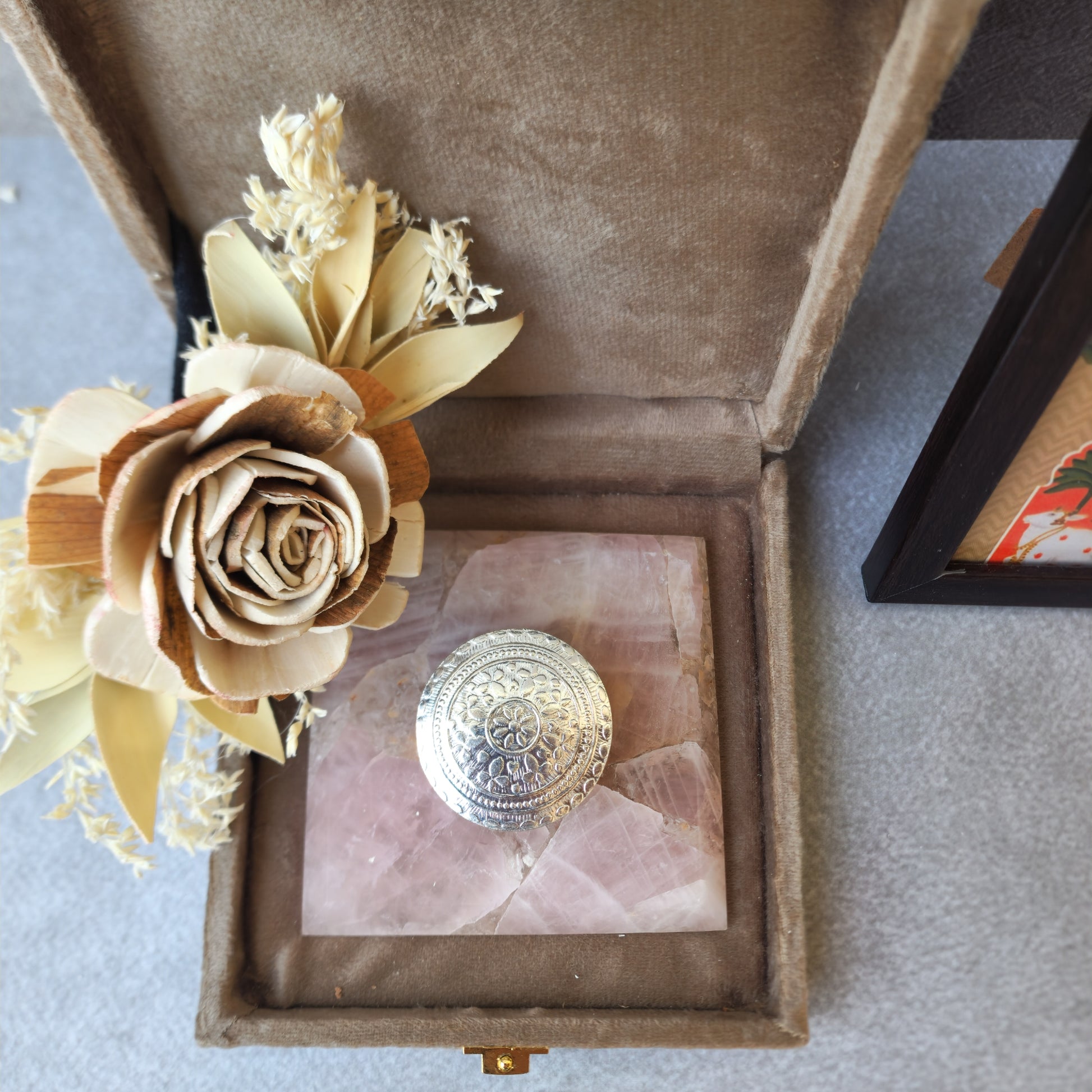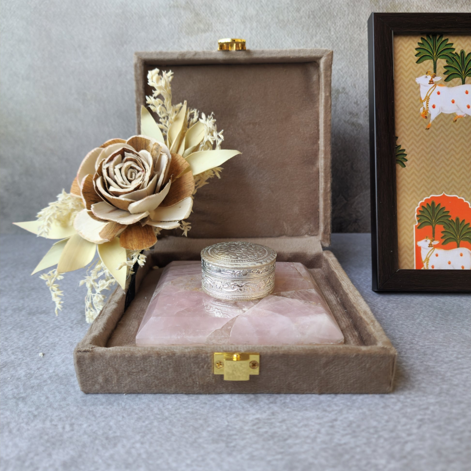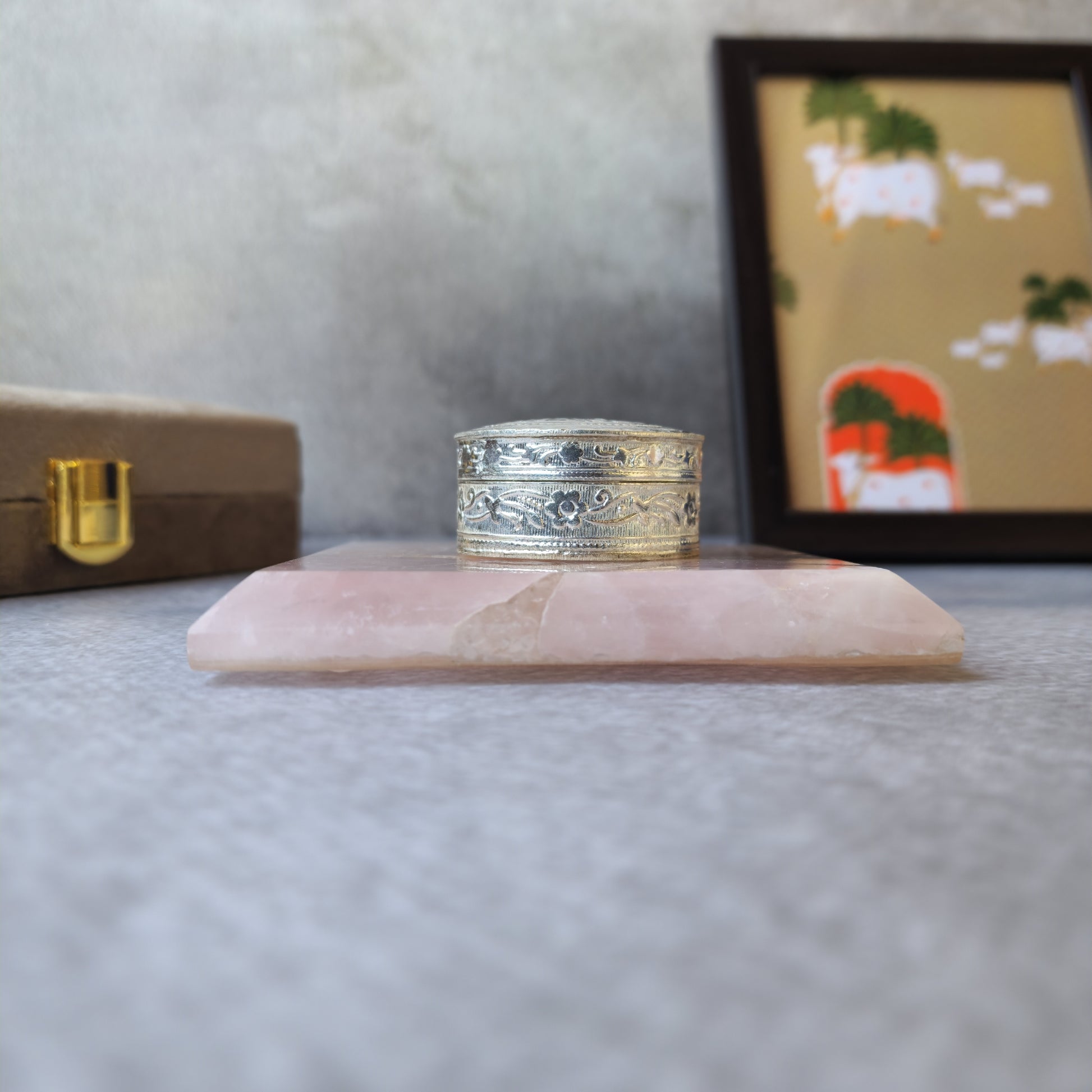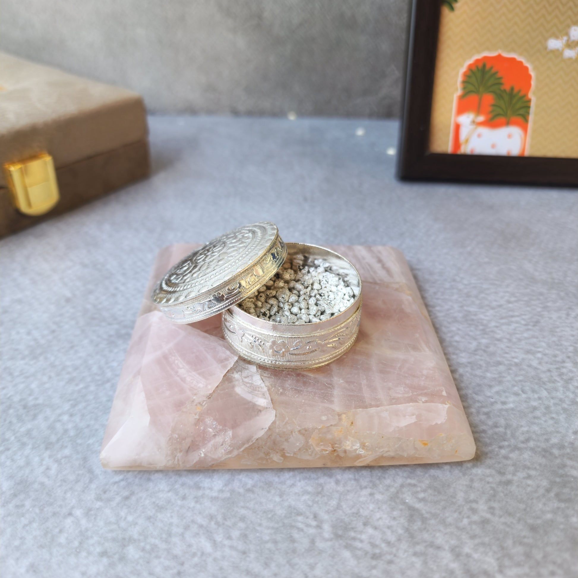 This Luxurious Gemstone Coaster With An Intricately Carved Silver Dibbi Is A Perfect Blend Of Elegance And Tradition. The Coaster, Crafted From A Natural Gemstone, Adds A Touch Of Sophistication To Any Table Setting, While The Beautifully Detailed Silver Dibbi Serves As A Refined Holder For Premium Elaichi (Cardamom). Designed To Be Both Decorative And Functional, This Set Makes An Exquisite Addition To Your Home Or A Thoughtful Gift For Special Occasions.