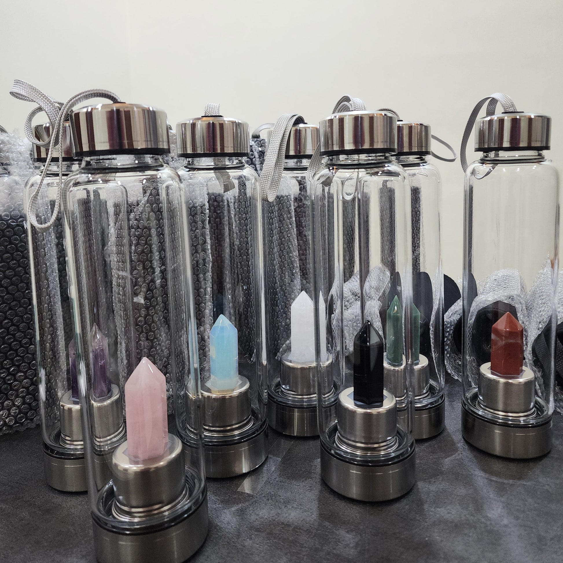 A modern crystal-infused water bottle designed for wellness lovers who appreciate beauty with purpose. Each bottle features a natural crystal tower that is believed to energise water, promote positive energy, and invite luck and abundance into daily routines. Whether at work, at the gym, or bedside - it feels intentional, calming, and quietly luxurious.